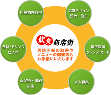 新規開業の際に必要なリソースを、飲食商店街に加盟する優良業者様の中からご紹介いたします!