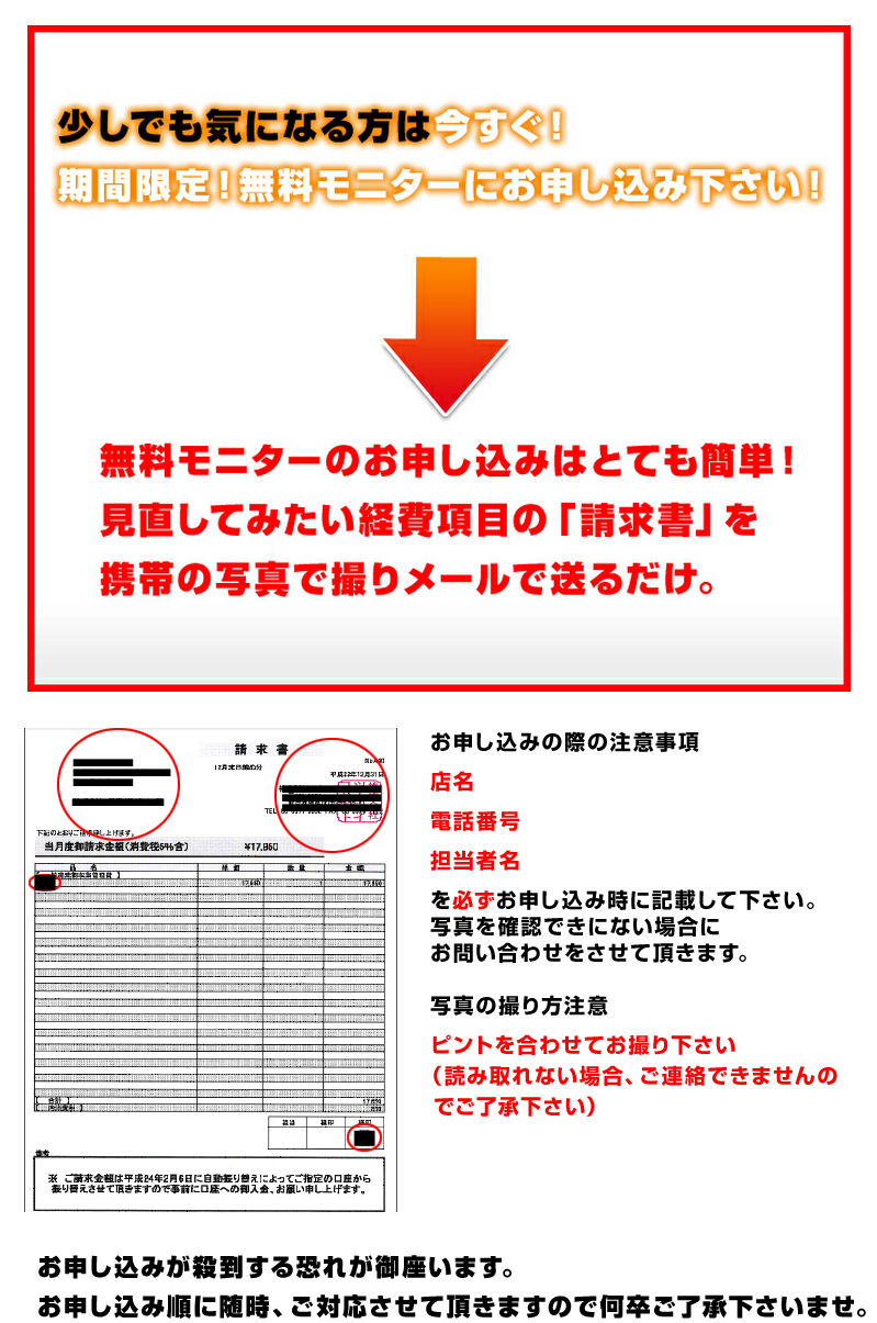 - いいえ。通常であればコストが削減出来た一部を会費として頂戴しておりますが、今回は「期間限定!無料モニター募集」なので