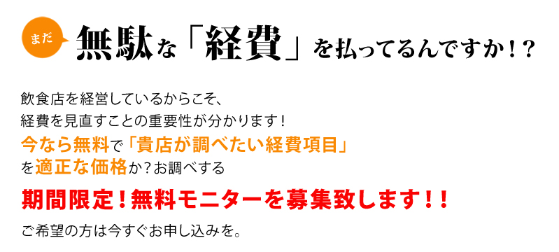 - いいえ。そのようなことは一切御座いません。各お店さんが適正価格かどうか?調べてみたい経費項目を期間限定!